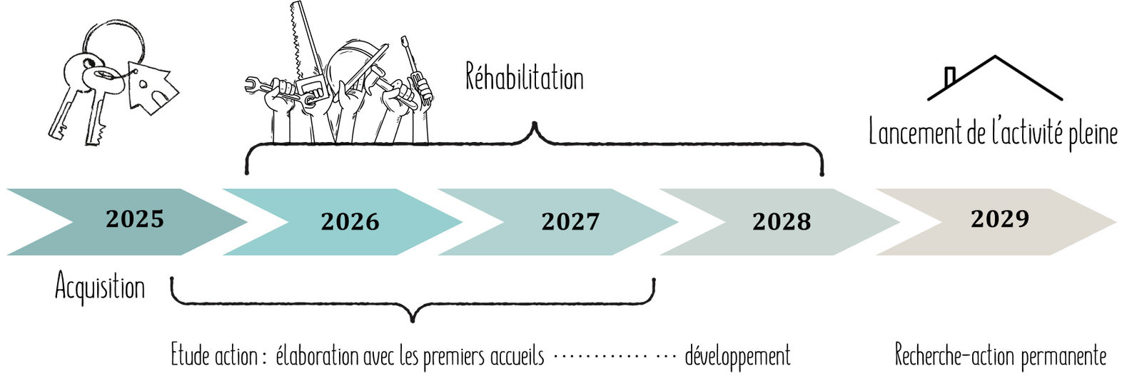 -> Entre 2026 et 2028, la réhabilitation et le déploiement progressif des activités permettront de construire collectivement ce nouvel espace, jusqu’au lancement de l’activité pleine prévu en 2029.