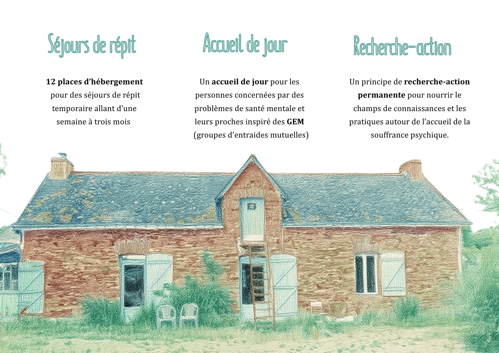 Des demandes de subventions faites conjointement à la Fondation de France et France Active Bretagne permettront de financer une première recherche action sur la question de l’accueil et de l’accompagnement des personnes en souffrance psychique adossée à des premiers accueils physiques sur le lieu à l’automne 2025.